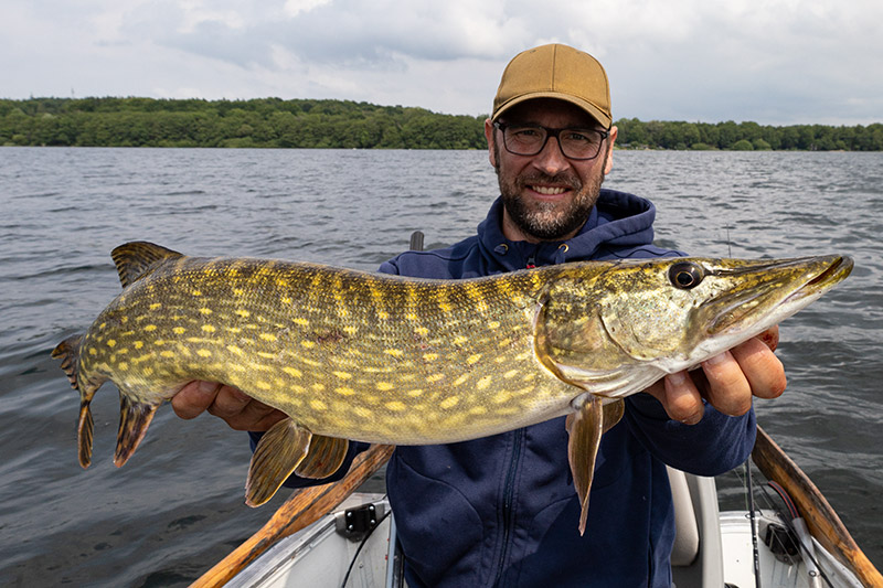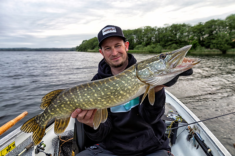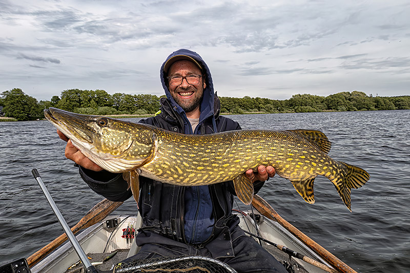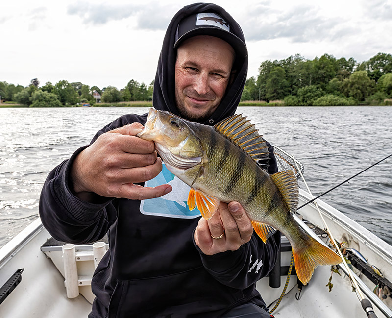 Dann stieg bei mir auch ein etwas bessere Fisch ein. Der Wind war immer noch zu dolle, sodass wir uns sehr dicht am Ufer lang hangelten. An einer kleinen Ausbuchtung machten wir halt, denn wir sahen einige Fischschwärme auf 4-5 m im Freiwassern. Und dann ging es wirklich nochmal rund am Abend. Die ganze Bucht voller Barsche. Keine Riesen, aber ein guter Abschluss mit ordentlich Frequenz. Auf twitchbait und Jigspinner im Freiwasser. Fast jeder Wurf gab Fisch. Aber dann war es auch schon Zeit, weiterzufahren. Der Wind war deutliche weniger geworden und wir ruderten gemütlich zu Slippe. Endstand jeder 11 Hechte, ich hatte ca. 30 Barsche und Daniel irgendwas über 20. Am Ende war es doch noch ein echt guter Tag geworden trotz Regen, Rutenbruch und Sturm.