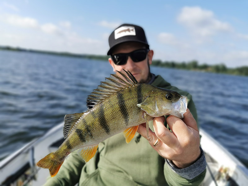 Wir fuhren weiter in eine windgeschützte Badebucht, doch dort war zwar kein Wind, aber auch nur sehr wenig Fisch. Hier und da mal ein kleiner Barsch und mini Hechte. Wir wagten uns also ein Stückchen weiter raus zu einem kleinen Berg, der bisschen im Wind stand. Dort erwischten wir dann ein paar bessere Barsche von knapp 30cm. Es war aber auch super viele kleine Hechte unterwegs. Daniel bekam super viele Bisse, aber kaum einer blieb hängen.